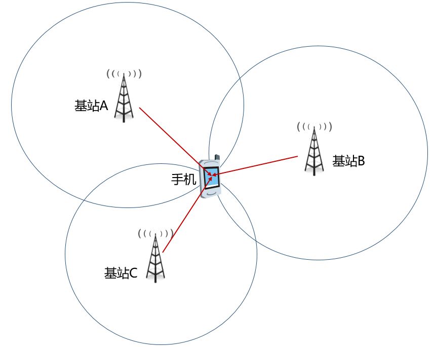 通常,在城市中,一部手機會在多個基站的信號覆蓋之下。手機會對不同基站的下行導頻信號進行“測量”,得到各個基站的信號TOA(到達時刻)或TDOA(到達時間差)。根據這個測量結果,結合基站的坐標,就能夠計算出手機的坐標值。