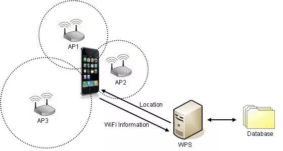 當一個設備處在這樣的網絡中時,可以將收集到的這些能夠標示AP的數據發送到位置服務器,服務器檢索出每一個AP的地理位置,并結合每個信號的強弱程度,計算出設備的地理位置并返回到用戶設備,其計算方式和基站定位位置計算方式相似,也是利用三點定位或多點定位技術。